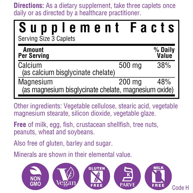 - Caplets contain Albion Chelated Minerals, 500 mg of Calcium from Calcium Bisglycinate and 200 mg of Magnesium from Magnesium Bisglycinate and Magnesium Oxide