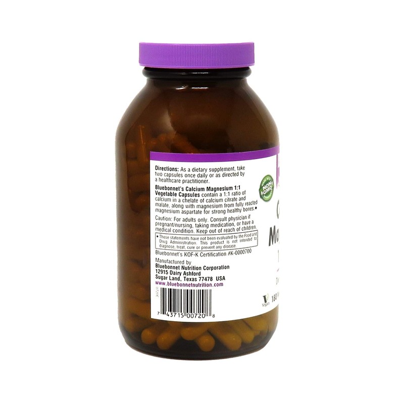 BlueBonnet Calcium Magnesium 1:1 Ratio Vegetarian Capsules, 180 Count, White