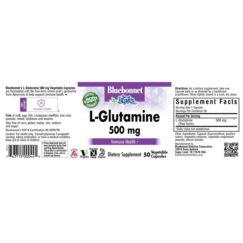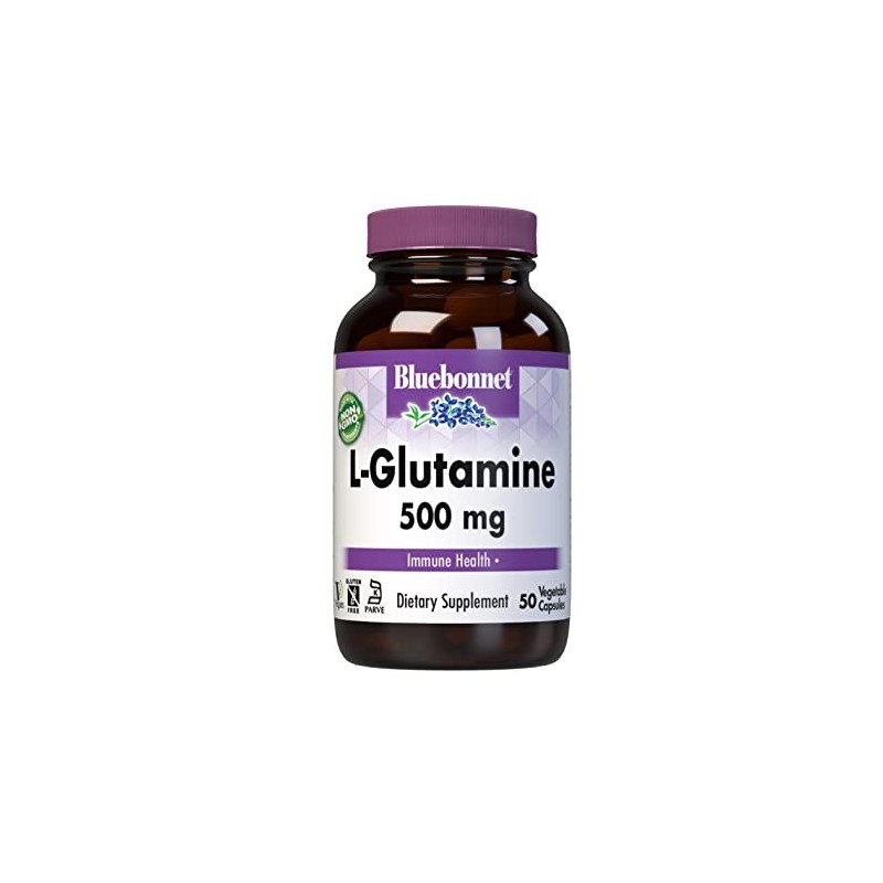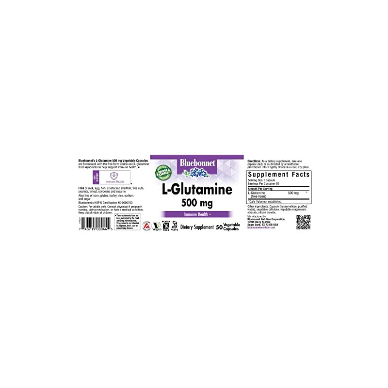 Bluebonnet Nutrition L-Glutamine 500mg, Supports Immune Function, Nitrogen Transporter, Soy & Gluten-Free, Non-GMO, Kosher Certified, Vegan, 50 Vegetable Capsules, White, 50 Count