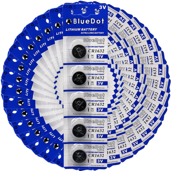 BlueDot Lithium CR1632, 3 Volts Lithium Coin Cell Long-Lasting Batteries, Powers Small Devices Such as Watches, Key fobs, Cameras, and More, Pack of 100