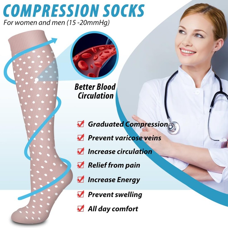- UPGRADE YOUR COMPRESSION SOCKS DRAWER! - With all the tasks of work and family (and of life itself!) we may forget to pay attention to and maintain the health of our legs. Our compression socks are designed to help increase circulation, improve leg and foot comfort, and reduce soreness and swelling, increase energy, All day comfort.Great for long periods of sitting or standing, endurance sports, flying and travel, post-workout recovery, pregnancy, and spider & varicose veins.