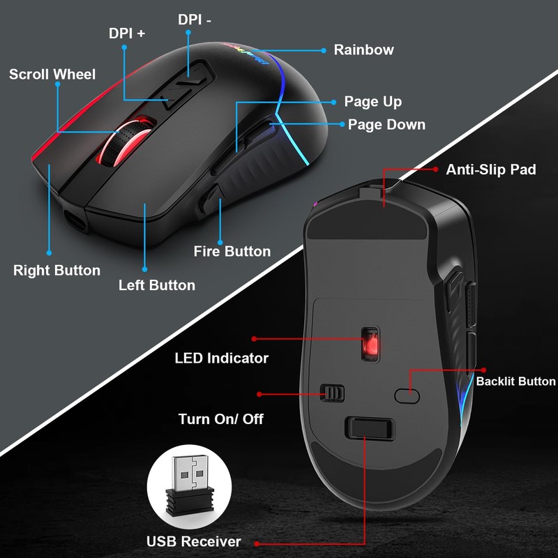 • 【RGB Gaming Keyboard and Mouse】: The wireless keyboard with 7 colors+ RGB Rainbow lighting, gorgeous backlit effects to choose; 4 level of backlight brightness and breathing speed; The mouse has a built-in 7-color cyclic gradual lighting effect. Offer unique visual experience and cool game atmosphere. The clear light-up letters make it easier to find your keys in the dark.