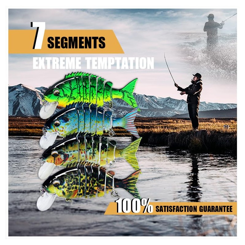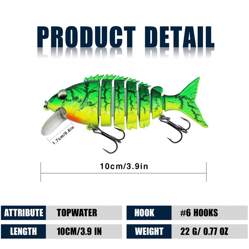 - 7 SEGMENTS: Made by 7 segment multi-jointed body, BLUEFISHER fishing lures swim with S-shape which will imitate a real fish to tempt the target, by changing the retrieval speed and rhythm, it can easily imitate an injured baitfish, inducing the fish to attack