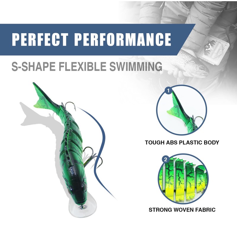 - HIGHLY PERFORMANCE: The jointed swimbaits body is constructed with tough ABS plastic and connected by super strong mesh woven fabric to ensure the high performance, the separate part are puncture, tear resistant and extremely durability.