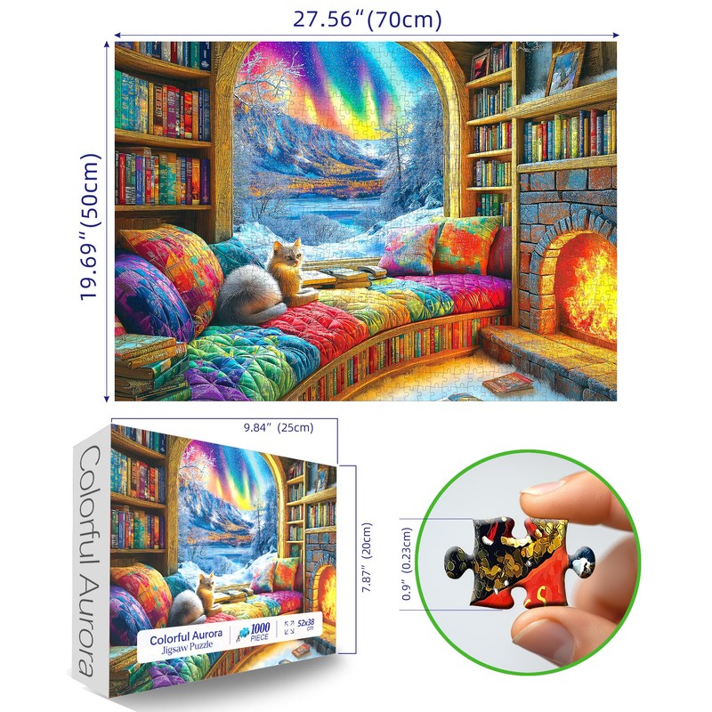 Blueforest Northern Lights Landscape Jigsaw Puzzles for Adults Fantasy Fairy Cat 1000 Piece Book Room Puzzle for Adults with Letters on Back Challenging Family Puzzle