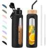 BLUEGO 900ml Glaswasserflasche mit Strohhalm und 2 Deckeln Kaffeetasse aus Glas mit Zeitmarkierung und Silikonschutz Glasbecher für Getränke Soda Cola BPA-frei, Schwarz