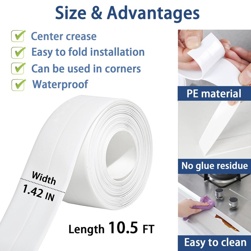 - Premium Caulk Tape Most of tape on the market is PVC, But we use high quality PE material, Softer, More durable and foldable. Caulk strips for bathroom waterproof suitable for vertical walls or uneven surfaces, Smooth finish, No yellowing, No PBA, Healthy and safe. 1.42 inch width enough to cover most gaps, 10.5 feet in length is enough for new DIYers to practice!