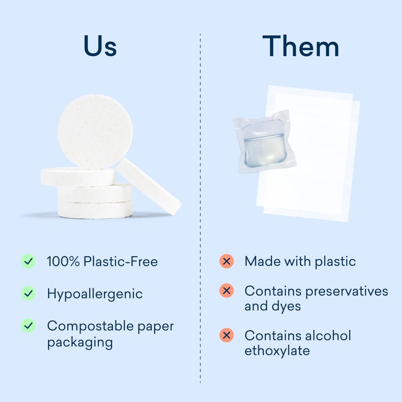 - PLASTIC-FREE, ECO-FRIENDLY LAUNDRY TABLETS. The first and only plastic-free Laundry Detergent Tablets that are tough on stains, but gentle on the planet. Our 100% plastic-free tablet is just as easy as any detergent pod, without any of the plastic film (PVA) found in most conventional pods.