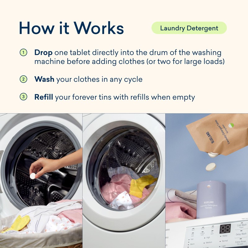 - EASY TO USE: Drop one tablet directly into the drum of the washing machine before adding clothes (or two tablets for large loads). Add your clothes and select your cycle.