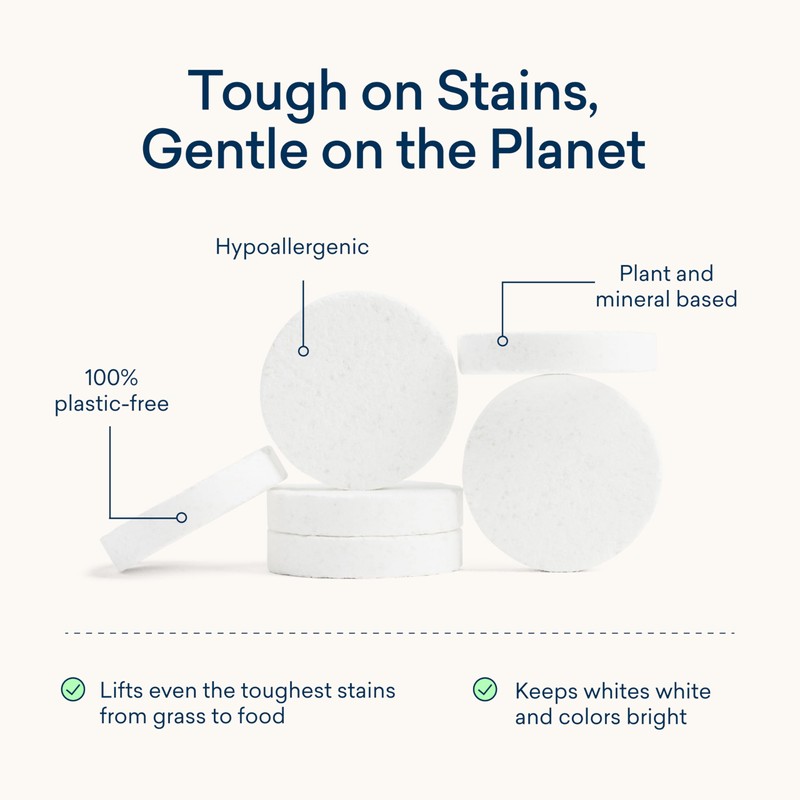 - PLASTIC-FREE, ECO-FRIENDLY LAUNDRY TABLETS. The first and only plastic-free Laundry Detergent Tablets that are tough on stains, but gentle on the planet. Our 100% plastic-free tablet is just as easy as any detergent pod, without any of the plastic film (PVA) found in most conventional pods.