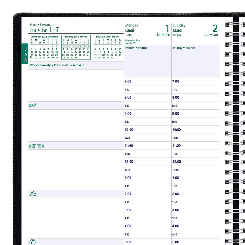 - Seven-day planner with a monthly planner before each month. Each spread has boxes for daily priorities, phone calls, correspondence, and personal notes