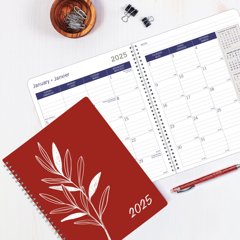 • DuraGlobe Monthly Planner spanning 14 months, December 2024 to January 2026. Month-on-two-pages format and one lightly ruled block per day layout (Sunday-Saturday). Dedicated space for notes on each spread. Bilingual: English and French.