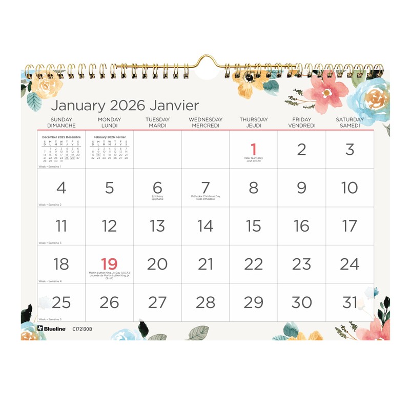- VERSATILE | The Blueline Colourful Monthly Wall Calendar spans 12 months, January to December 2026. One month per sheet, one block per day (Sunday-Saturday). Colourful Spring design. Bilingual: English and French.
