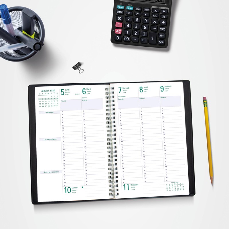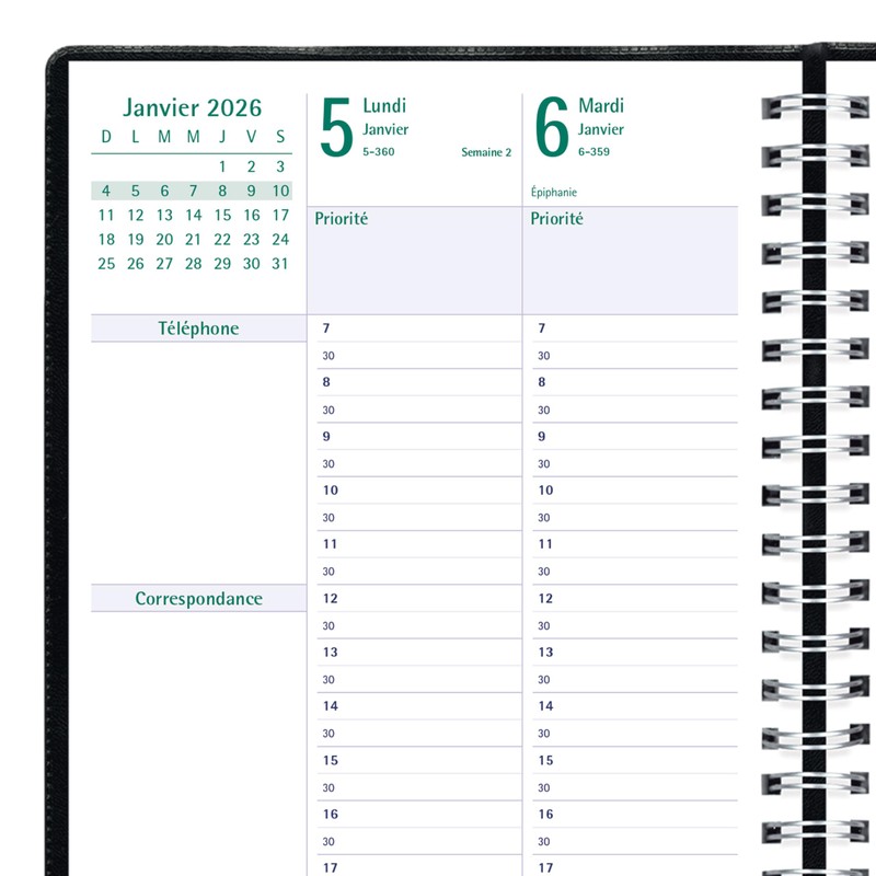 - VERSATILE | The Blueline Timanager Planifi-Action Weekly/Monthly Appointment Book and Planner spans 13 months, December 2025 to December 2026. Week-on-two-pages and five-day, half-hour appointment schedule from 7:00 a.m. to 8:30 p.m. Ruled space for Saturday and Sunday. Monthly planner before each month. French.
