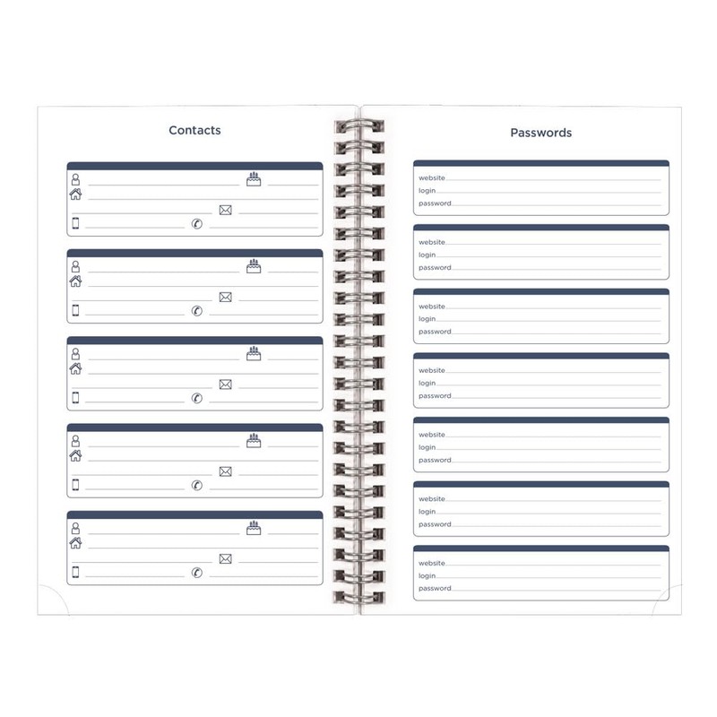 - CONVENIENT | Maximize these updated features: quarterly planner, event calendar, contacts (telephone/address section), passwords, to do lists, note pages, and three-year overview. Four-color stickers for visual reminders. English language.