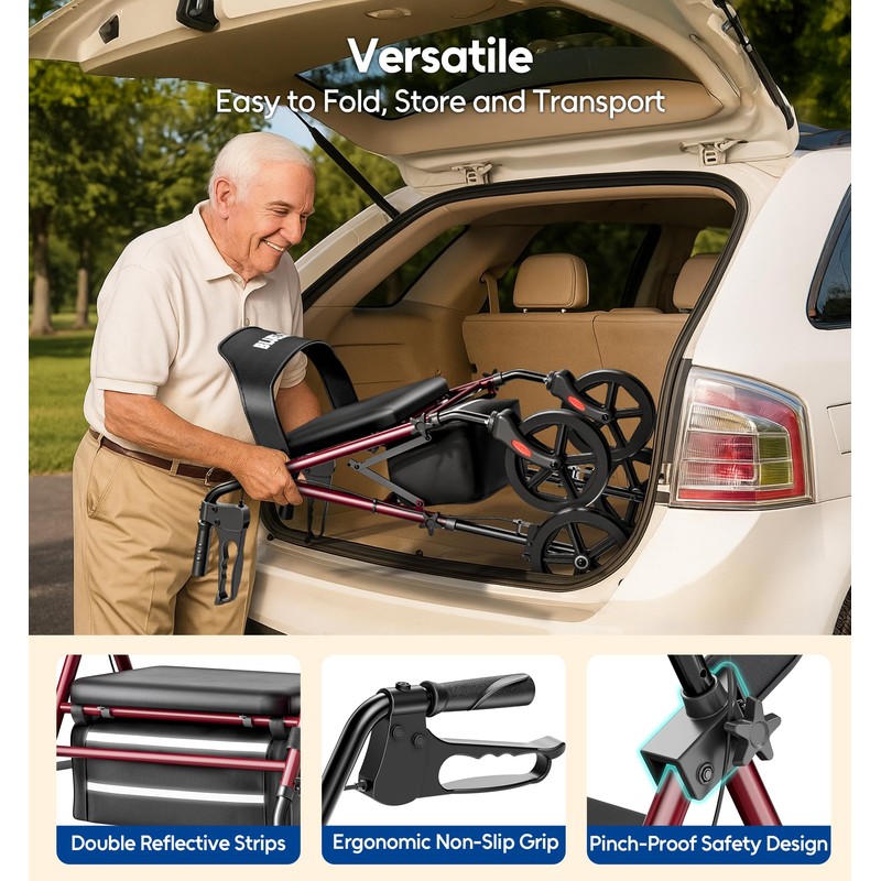 - Adjustable Comfort for All-day Use: This Senior Rollator with Seat offers 6 levels of handle height adjustment (for heights from 4'7“ to 6'6”) and a 3-position seat with a breathable backrest. The wider memory foam seat and breathable backrest reduce pressure on the hips and spine, making this Rollator with Seat ideal for extended periods of time away from home