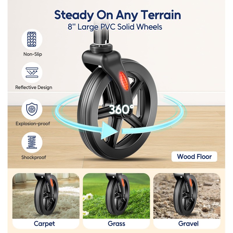 - 350 lbs Heavy-duty Stability: This senior walker features a reinforced aluminum frame and triangular load-bearing structure that can hold up to 350 pounds. Thickened tubing and puncture-resistant 8-inch all-terrain wheels ensure stability on gravel, grass or uneven surfaces, giving seniors confidence on any surface
