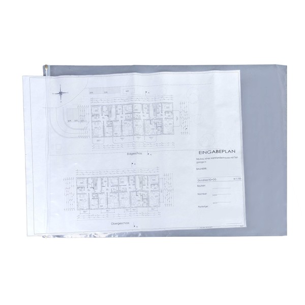BÖCK -Plan holder: for dry storage of documents on the construction site. On the construction site, dirt and rain can damage important documents such as plans or sketches. Plan holders from Böck protect your documents from water stains or wrinkles. The taped seams and high-quality workmanship keep your documents dry. As experts in dust protection systems with over 35 years of practical experience, we perfect products and productions tailored to the needs of our customers. Play it safe and trust our plan owners with your professional construction projects: your plans will never be damaged again! Buy waterproof and transparent plan holders online in the Böck shop. The plan holders from our online shop have long been part of the basic equipment of our company - regular customers - architects, construction managers or industrial designers - have been using them for their construction projects since 1979. With their format of 900 x 1280 mm, the Plan bags are suitable for many private or professional applications, e.g. for safely storing documents during a hike or sea trip, on construction sites. Construction work, excavations or in archives. Thanks to their thickness of 110 microns, a thickness that does not affect its transparency in any way, our tarpaulin covers are perfect for everyday use. The robustness of Böck plan holders makes them extremely durable and the lack of plasticisers allows ecological disposal in the form of a recyclable PE film. The high-quality material and the carefully processed closure system of our tarpaulin covers are 100% waterproof.