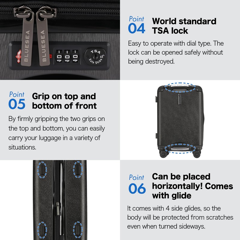 - Silent double casters that rotate 360°. It boasts extremely high mobility. You can also change direction smoothly in narrow spaces. It adopts world standard TSA lock. You can leave your luggage locked, and it will pass through customs smoothly.*The key is not included with this product as it is for airline inspection only.