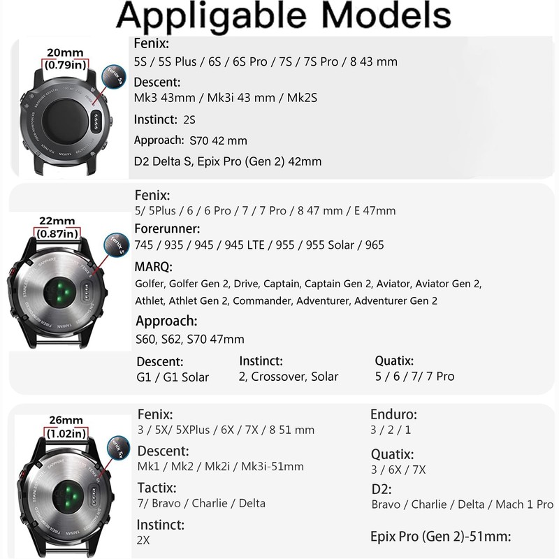 • 26 mm size QuickFit bracelet compatible with Garmin Fenix 8-51 mm / Fenix 7X / Fenix 6X / Fenix 5X, Fenix 5X Plus / Fenix 3, Fenix 3 HR, Fenix 3 Sapphire / Enduro 1, Enduro 2, Enduro 3 / Epix Pro (Gen 2)-51 mm / Descent Mk1, Descent Mk2, Descent Mk2, Descent Mcent Mc2iDescent Mk3i-51 mm / Instinct 2X / Quatix 3, Quatix 6X, Quatix 7X / Tactix 7, Tactix Bravo, Tactix Charlie, Tactix Delta / D2 Bravo, D2 Charlie, D2 Delta, D2 Mach 1 Pro