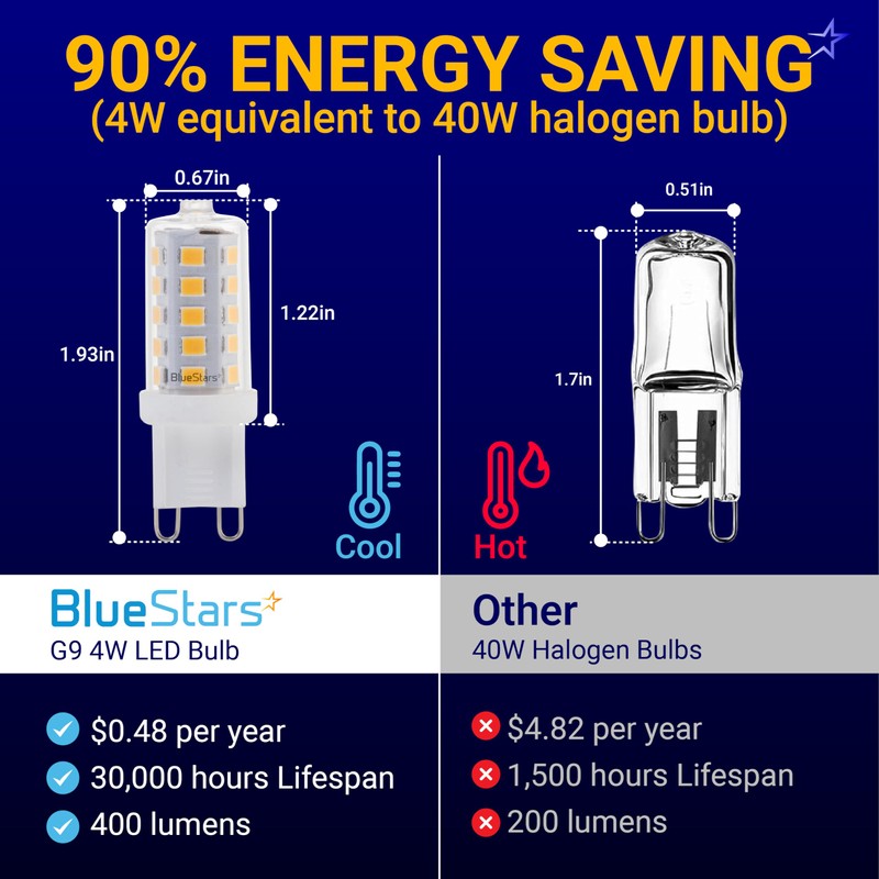 BlueStars G9 4W 2700K LED Light Bulbs can save energy up to 90%. 4W is equal to a 40W incandescent light bulb, which costs only $0.48 per year to operate (based on 3 hours/day, 11¢/kWh) and you save on energy bills while reducing your carbon footprint. High lighting efficiency and little heat generation, no lead or mercury.