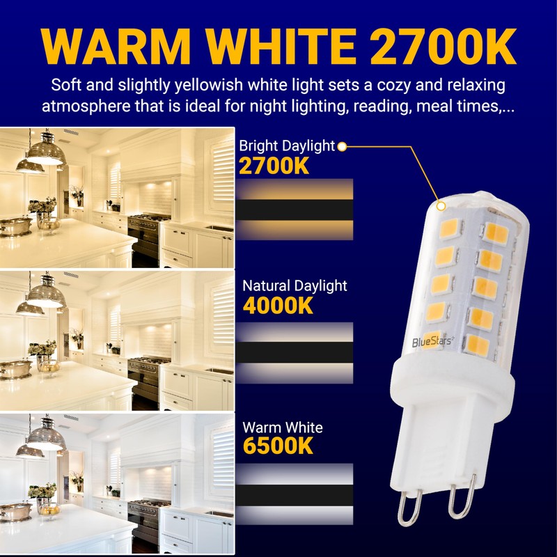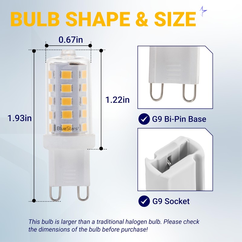• Wide Application: BlueStars G9 4W 2700K LED 120V Bulb is compatible with a G9 Bi-Pin Base, and it can be easily integrated into any G9 lighting fixture.. Ideal for various indoor lighting styles, including crystal chandeliers, bathroom vanity lights, sconces, ceiling fans, cabinet lights, wall sconces, corridor, bedroom, living room, etc. Not suitable for enclosed fixtures, oven lights, or small decorative lamps with tight clearance.
