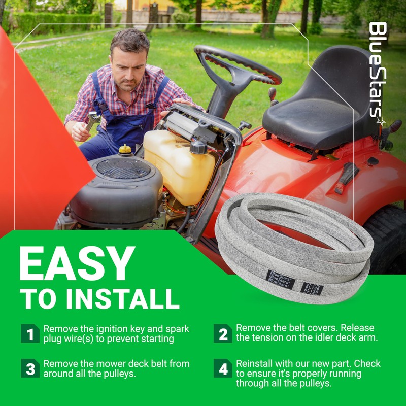 - EASY TO INSTALL: Please prepare a nut driver set in advance and wear work gloves to ensure safety while repairing. Remove the ignition key and spark plug wire(s) to prevent starting. Remove the belt covers. Release the tension on the idler deck arm. Remove the mower deck belt from around all the pulleys. Reinstall with our new part. Check to ensure it's properly running through all the pulleys.