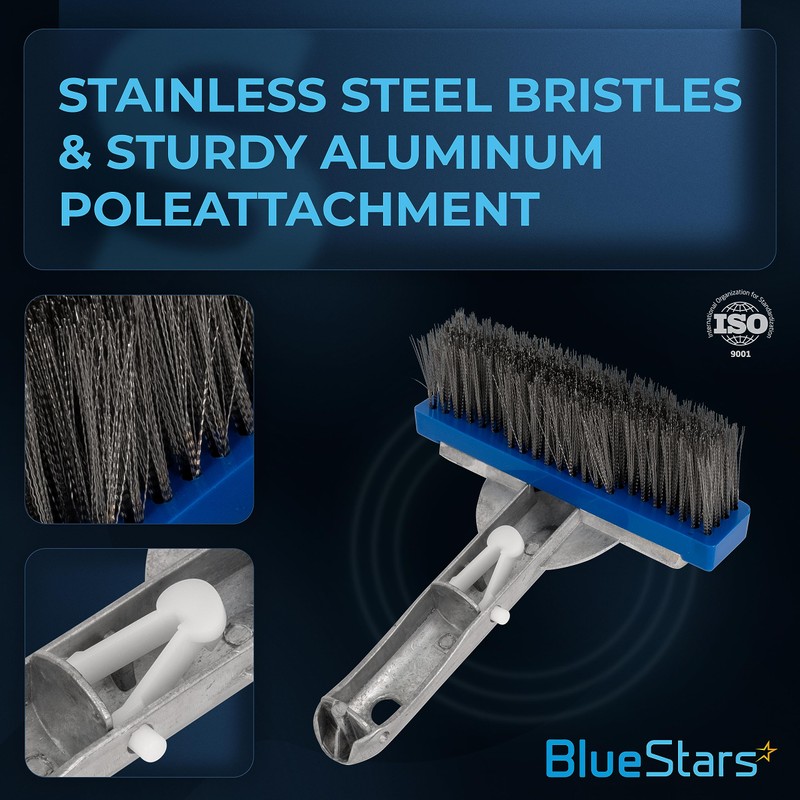 - ✅ BUILT WITH DURABILITY: With a sturdy Aluminum pole attachment, BlueStars Pool Brush is incredibly durable and reliable. Its reinforced Aluminum plate adds extra strength and longevity. The robust stainless steel bristles effectively tackle and remove even the most stubborn stains.