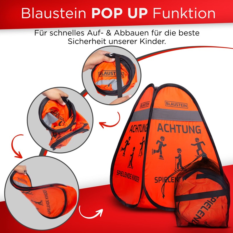 - Quick assembly and disassembly The Blaustein warning triangle is easy and quick to set up, simply remove from the carry bag and let go. To disassemble, simply hold on two ends and rotate – the warning cube is small again and can be stowed away.