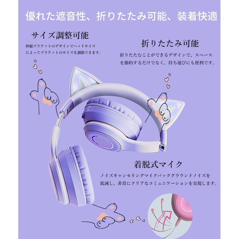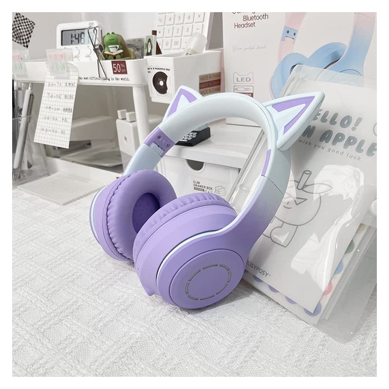 - Cute Cat Ears, LED Lights; Note: When using an audio cable, the microphone cannot be used: The cat ear design is cute, and the Bluetooth headphones with LED lights will flash to match the rhythm and change the color to match the music, and will instantly brighten up the atmosphere when gaming. Sparkling and very cute