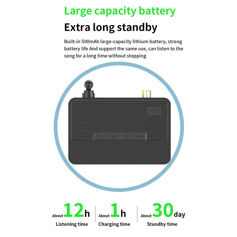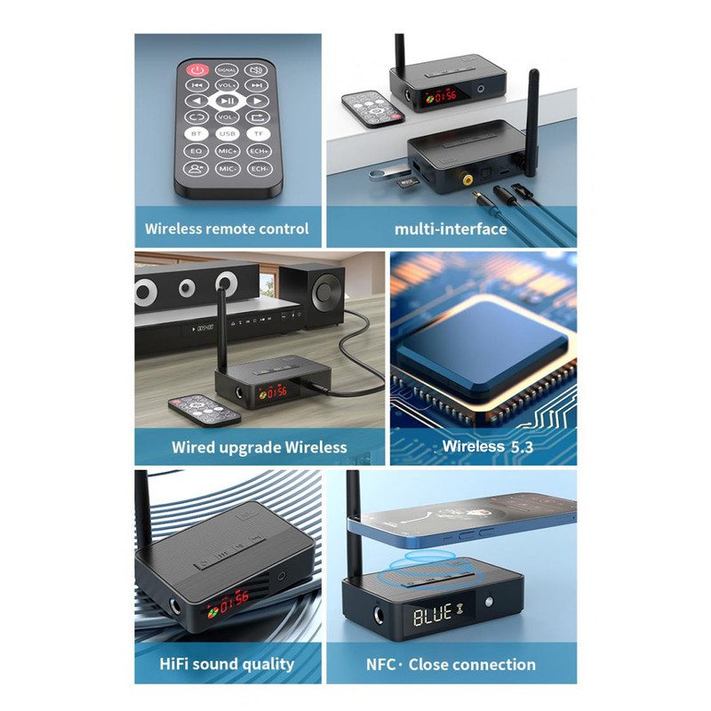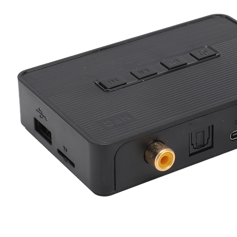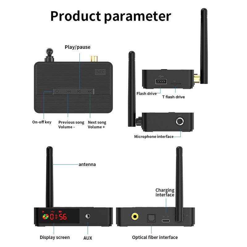 1、Wireless Transmission: The bluetooth 5.3 receiver makes it easy to wirelessly transmit hifi sound from any bluetooth enabled device (including smartphones, tablets, computers, laptops) to any stereo system or speakers. 2、Bluetooth Receiver: Just a bluetooth receiver that provides bluetooth functionality to existing stereos, active speakers, car stereos, home stereos, 3.5mm wired headphones, not a bluetooth transmitter or amplifier. 3、NFC Function: Bluetooth 5.3 receiver with upgraded NFC function, cell phone connects with a touch, NFC enabled mobile devices can be connected by touching the bluetooth receiver, convenient and fast. 4、Input and Output: Support AUX, optical sound, coaxial sound output, compatible with most devices. Support Bluetooth sound, USB, memory card sound input, Bluetooth sound plus U disk playback and memory card playback function, easy to use. 5、HiFi Stereo: Bluetooth 5.3 chipset is an advanced solution that provides premium wireless sound performance, ensures hifi sound signals for streaming music to your home stereo system, and supports SBC decoding. 6、Long Battery Life: The bluetooth 5.3 receiver comes with a built in 500mAh lithium polymer battery that supports charging while listening for about 8 hours. The device is plug and play, no need to install any software driver, simple and fast operation.