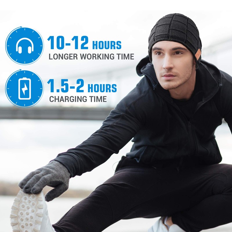 - Longer Working Time in the Market: HIGHEVER Bluetooth winter hat upgrade USB chargeable battery, Built-in 200mAh high-performance battery, Charge about 1.5-2 hours provide up to 10-12 hours playing time. HIGHEVER Bluetooth beanie hat lets the user enjoy music at anytime and anywhere. Suitable for gym, workout, running, yoga and other outdoor activities. Good choice for dad gifts, Christmas gifts, Thanksgiving day's gifts, birthday gifts.