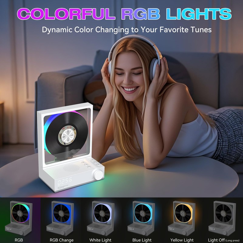 - 【RGB Colorful Light Show】The latest portable CD player is not only a cd player but also as a unique night light, it provide different color-changing themes. The 5 light modes are colorful lights,automatic change,white light,blue light,yellow light. While you enjoy music, gradient lights would truly bring you party atmosphere