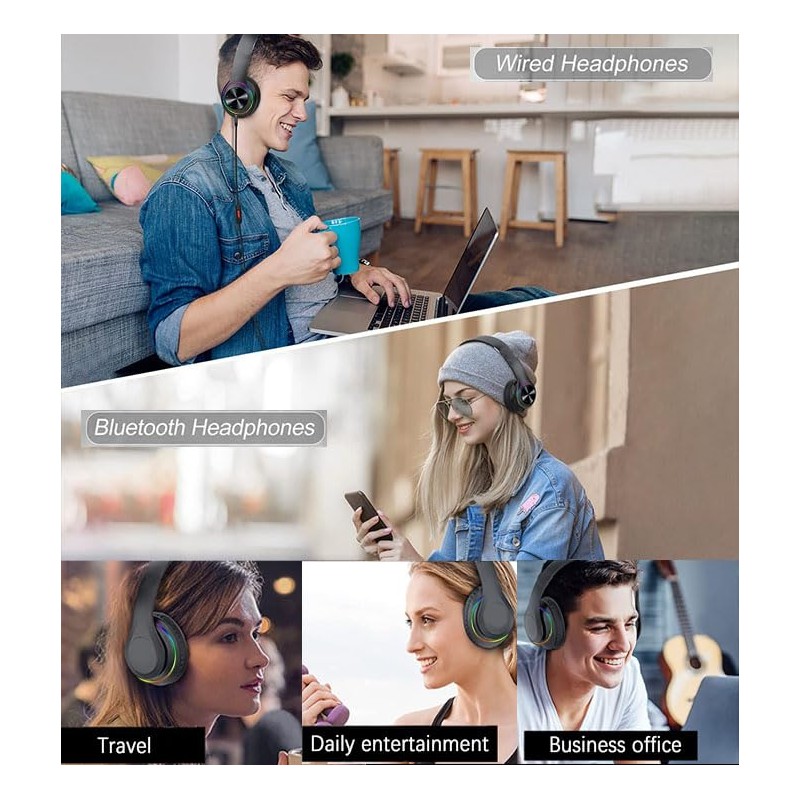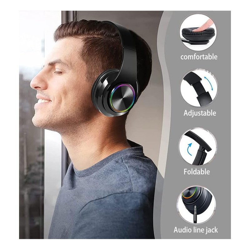 - 【Comfortable and Adjustable】: The adjustable headband of these headphones is ergonomically designed and has super soft ear cups so you can adjust the fit to suit your needs, the foldable design saves space and is easy to carry,The headset has a breathing light, colourful and cool, and the headset is foldable and stretchable. Easy to control: "+/-" buttons for volume and music track control, play/pause/answer phone/hang up.HiFi Stereo,deep bass/clear voice.