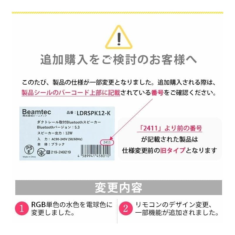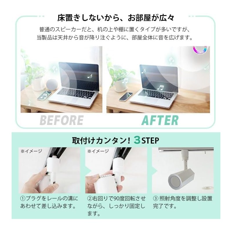 - Bluetooth speaker with ring track lighting; Supports single color or RGB; Specifications: Bluetooth version: 5.3; Bluetooth transmission distance: approx. 32.8 ft (10 m); Modulation system: FHSS; Supported profile: A2DP; AVRCP; Driver unit: φ2.0 inches (50 mm) 4 Ω; Playback frequency band: 50 Hz - 20 kHz; Power consumption: 12 W. Operating voltage: AC 90 V Speaker Sensitivity: 80 dB/mW Litter Part Size (Approx.): Φ3.2 x 5.2 inches (82 x 132 mm); Weight: 12.5 oz (369 g); Product Code: LDRSPK12-K / LDRSPK12-W; Note: Cannot be used with angled ceilings, boat ceilings or duct rails attached to sides (walls). Please be installed on flat ceilings