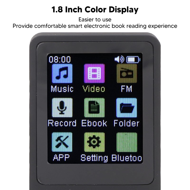 - [Electronic Book Reading] This music player has a 1.8 inch color display for easier use, providing you with a comfortable and smart electronic book reading experience. Support TXT file type, carry a huge amount of books with you.