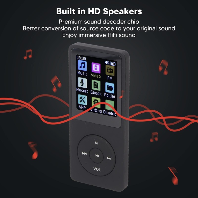 - [HD Speaker] Bluetooth MP3 player has built in HD speaker with premium sound decoding chip, you can better convert the source code to your original sound and enjoy the immersive HiFi sound, for music lovers.