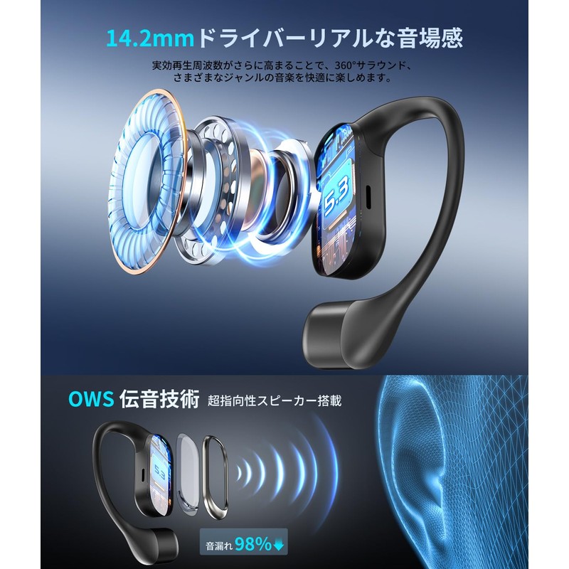 - (Excellent Fit & IPX5 Waterproof) Wireless earbuds have an ear hook design and soft ear hook that hangs over the top of the ear, securing the earbuds securely to your ears for an excellent fit. And with IPX5 waterproof feature, OWS earbuds are resistant to daily rain and sweat. This allows you to use it with confidence even during intense workouts and humid environments such as running and outdoor activities. In addition, it can be easily cleaned by wiping with a damp cloth. *If you sweat a lot after exercise, please wipe the sweat on the surface of the earphone, then put it back into the charging case