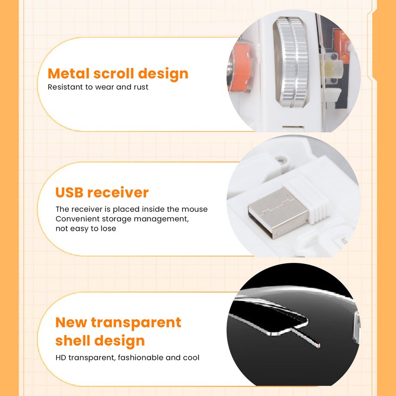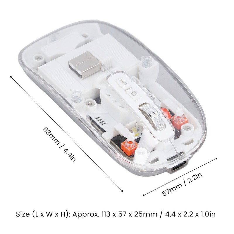 1、METAL SCROLL: Wireless mouse is designed with metal scroll, which are not easy to rust and enhance the operating experience. Compact design, easy to put into pocket or backpack, convenient to carry. 2、TRANSPARENT AND ERGONOMIC DESIGN: This wireless mouse is designed with a transparent shell, you can clearly see the inner structure, very cool. Symmetrical ergonomic design, comfortable hand feeling. 3、3 MODES: Mouse supports 2.4G, BT1, BT2 3 mode connection, you can switch the working mode at will, support for iOS, for Android, for Windows system. Suitable for PC, laptop, smartphone, etc. 4、CONVENIENT AND UNIQUE DESIGN: Wireless mouse with USB receiver, built in inside the mouse, easy to manage, not easy to lose. Removable magnetic surface cover for easy maintenance. 5、ADJUSTABLE DPI: Wireless Bluetooth mouse has three adjustable DPI (800, 1200, 1600), you can choose the speed that suits your needs, providing high sensitivity and accuracy.