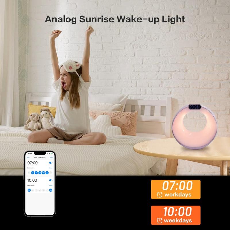 larm Function:Wake up light alarm clock has dual alarms function(The APP can set four alarms and can set any time from monday to sunday). When the alarm rings,press to activate snooze mode to delay the alarm for 9 minutes(APP can set 5-60min snooze) and can snooze up to 5 times.