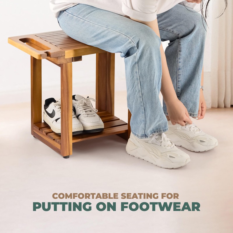 • 🌿 Crafted from Premium Acacia Wood: Made from high-quality Acacia wood, this bench is naturally water-resistant and built to withstand humid environments. Its elegant wood grain adds a touch of style to any bathroom or bedroom.