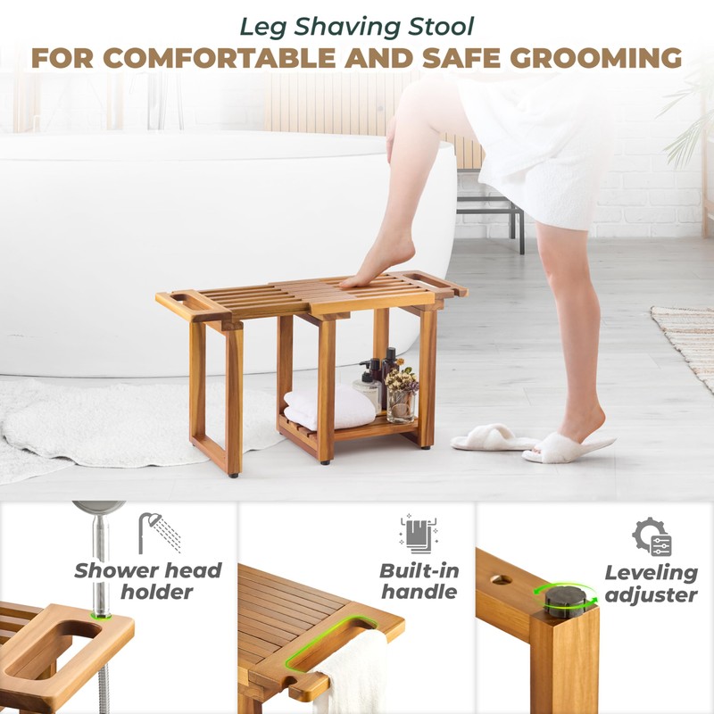 BLUEWEST Adjustable Shower Bench Stool for Inside Shower – 31.7'' Wood Bathroom Bench with Storage Shelf, Built-in Handle & Shower Head Holder, Waterproof Ideal for Sitting, Shelving Legs and Spa Use