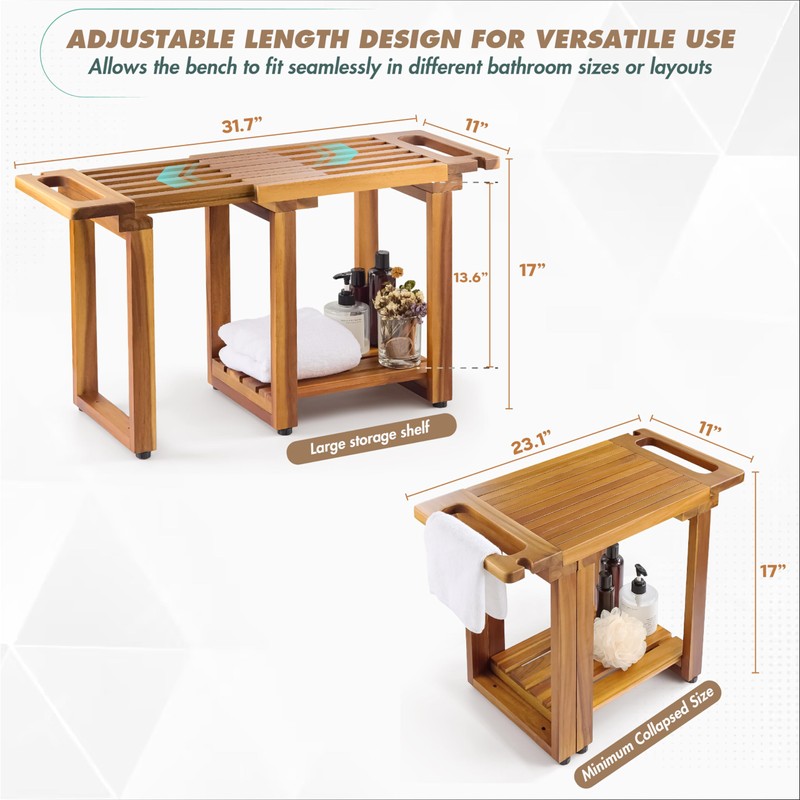• 🛠️ Adjustable Size for Versatile Use: This Acacia wood shower stool bench chair adjusts from 23.1” to 31.7” in length, with a width of 11” and a height of 17”, making it adaptable to different bathroom sizes and layouts for ultimate flexibility.