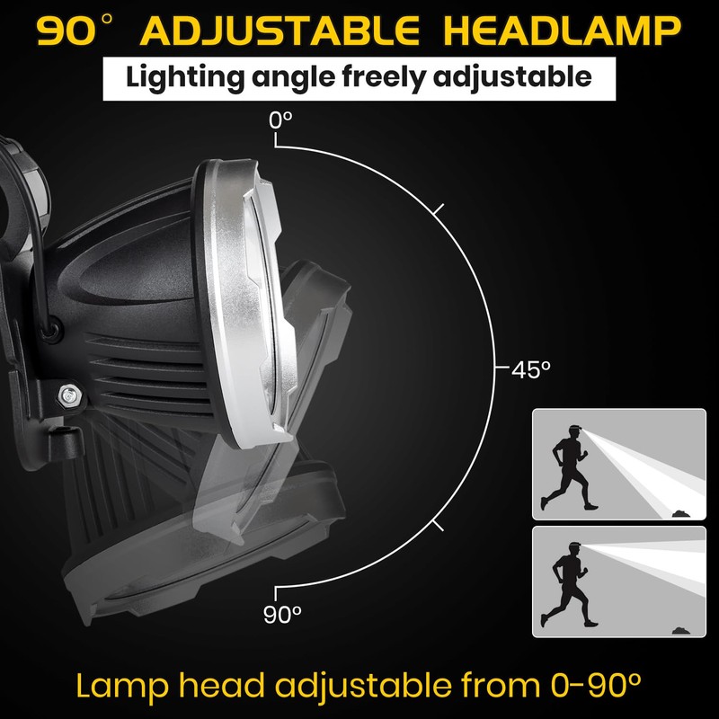 - 【90 ° Adjustable & Comfortable】 Headlamp designed 90 ° adjustable angle, each degree is very solid, so you can see the full range of vision from front to back. The adjustable elastic band on the headlamp allows you to satisfactorily adjust the size to keep the headlamp securely on your head, and it's removable, washable, and comfortable for both adults and children.