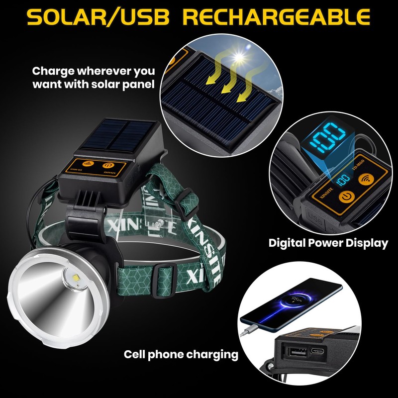 BlueYu Solar/Rechargeable Headlamps 20000 Lumens Super Bright Headlamp, 90°Adjustable 3 Modes IPX5 Waterproof USB C Rechargeable Head Lamp for Camping Running Cycling Hiking