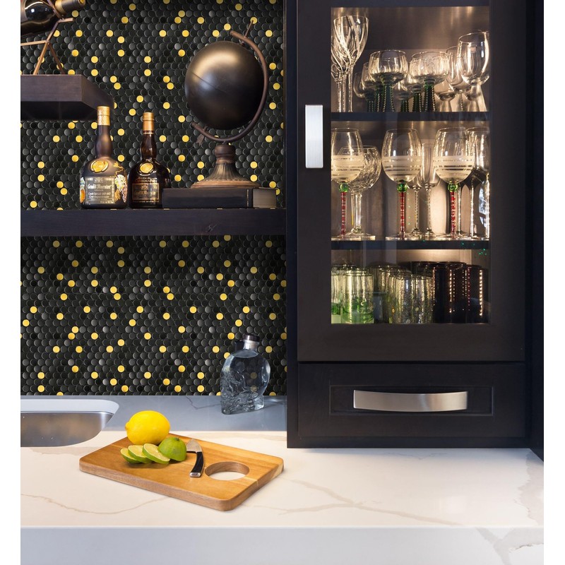Blujellyfish Black Backsplash Tiles for Kitchen Bathroom Walls Black and Gold Penny Round Mosaic Tiles (Box of 5 Sheets)