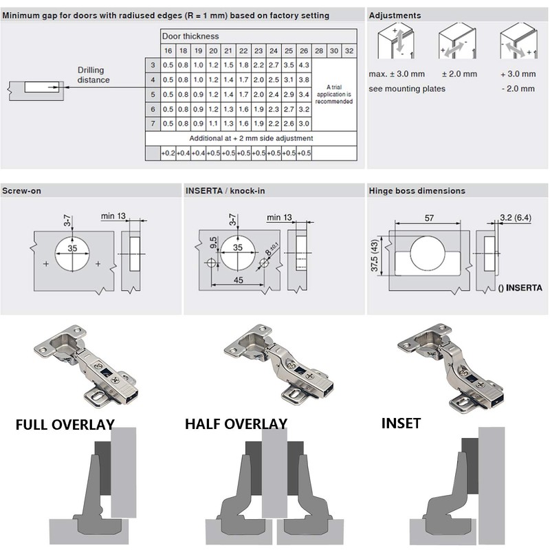 Pot drill hole 35 mm, distance between screw holes 45 mm.