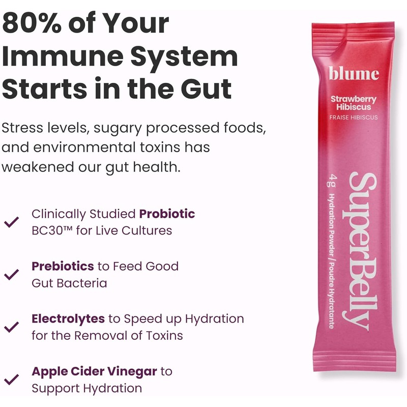 Blume SuperBelly Hydration Packets, Sugar-Free, with Probiotics & Electrolytes, Strawberry Hibiscus, 15 Sticks