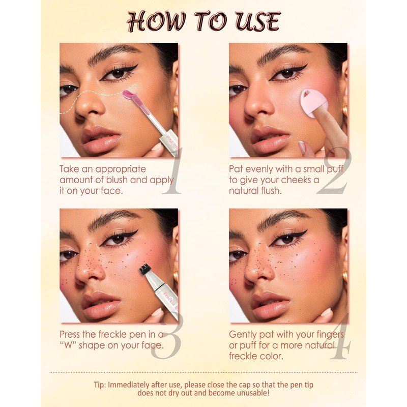 - How to use - Apply an appropriate amount of blush to your face, tap it off with your fingertips or tassel, then open the other end and press it over your face in a "W" shape to give the false freckles a natural distribution effect. (Note: please close the cap immediately after use, so that the tip does not dry out and become unusable).