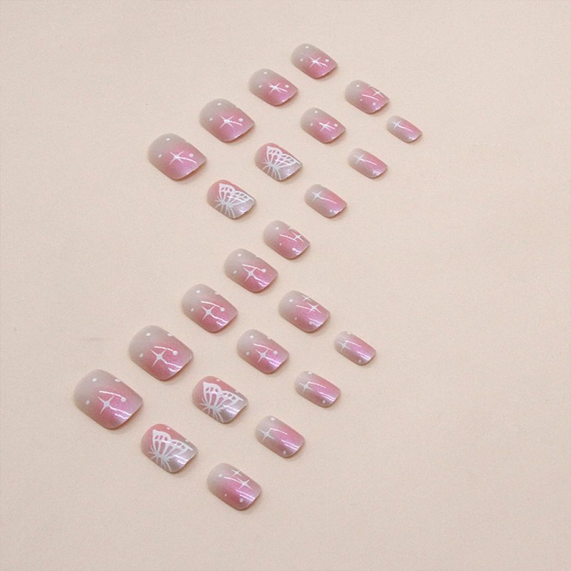 Blush Press on Nails Short Square Fake Nails Aurora False Nails With White Butterfly Star Designs Full Cover Stick on Nails Acrylic Reusable Artificial Nails Glue on Nails for Women 24Pcs